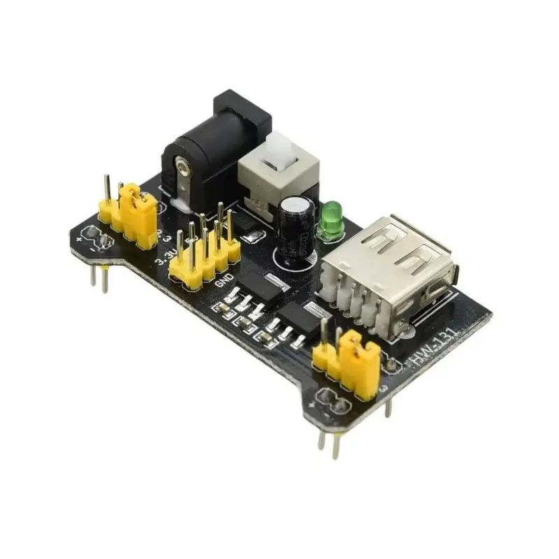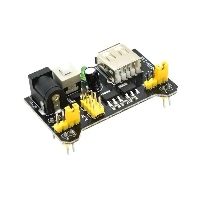 Adjustable output voltage: 3.3V and 5V Dual output channels for breadboard power rails Compact and easy to use Overcurrent protection On/Off switch Power indicator LEDs Input power via USB or DC barrel jack Technical Specifications: Input Voltage: 6.5V to 12V (via DC barrel jack) or 5V (via USB) Output Voltage: 3.3V and 5V Output Current: Up to 700mA Power Output: Dual output channels for breadboard rails Connectors: USB Type-A, DC barrel jack, and breadboard pins Dimensions: Typically around 53mm x 35mm x 15mm Operating Temperature Range: -40°C to +85°C